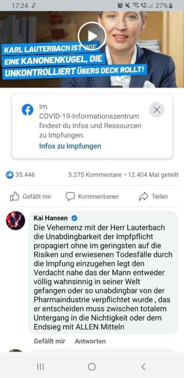 Berlin. Das Ganze spielte sich unter einem Video von AfD-Chefin Alice Weidel ab, in dem diese Lauterbach mit einer Kanonenkugel vergleicht, die unkontrolliert übers Deck rollt. Hansen schrieb: “Die Vehemenz mit der Herr Lauterbach die Unabdingbarkeit der Impfpflicht propagiert, ohne im geringsten auf die Risiken und erwiesenen Todesfälle durch die Impfung einzugehen legt den Verdacht nahe, dass der Mann entweder völlig wahnsinnig in seiner Welt gefangen oder so unabdingbar von der Pharmaindustrie verpflichtet wurde, dass er entscheiden muss zwischen totalem Untergang in die Nichtigkeit oder dem Endsieg mit ALLEN Mitteln”.